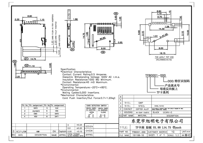 上一個(gè):TF卡座貼板 H1.75 L12.05 翹邊 黑LCP 銅殼鍍鎳 端子半金GF 卷裝